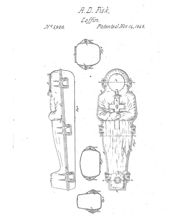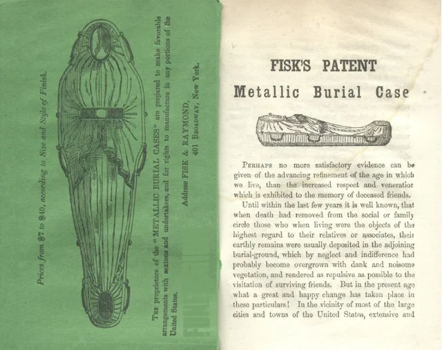 Викторианская новинка - «гроб Фиска», который обещал сохранять тела близких без разложения. Изготовленный из железа и герметично закрывающийся, этот гроб был доступен публике с 1848 года до 1860-х.