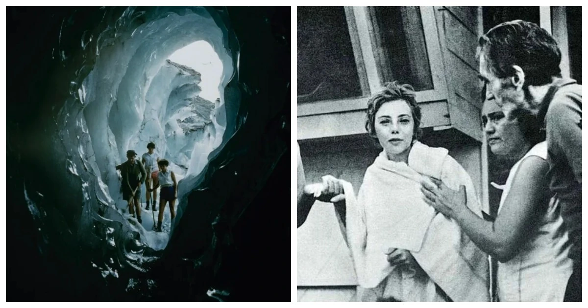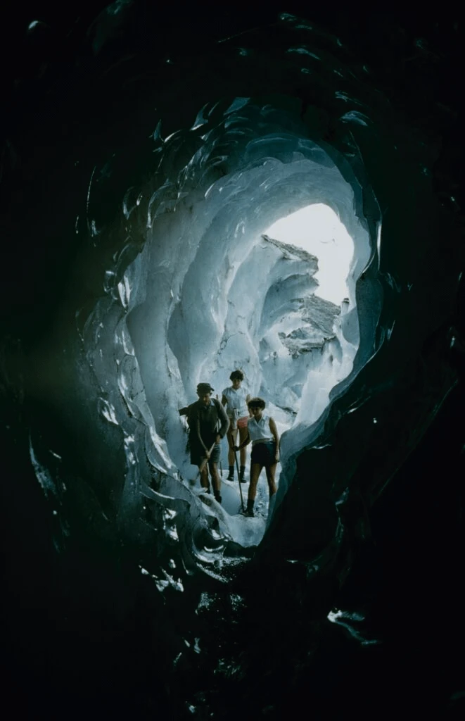 15. Группа туристов у входа в пещеру на леднике Франца-Иосифа на Южном острове, Новая Зеландия, 1959 год