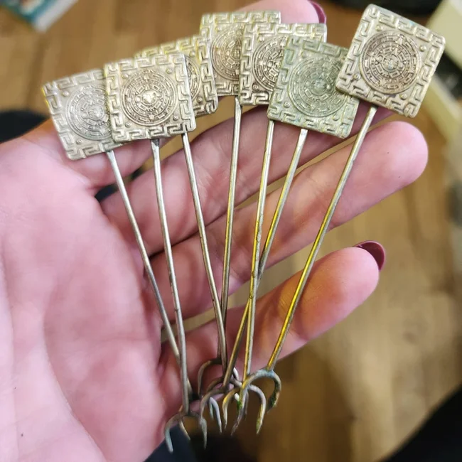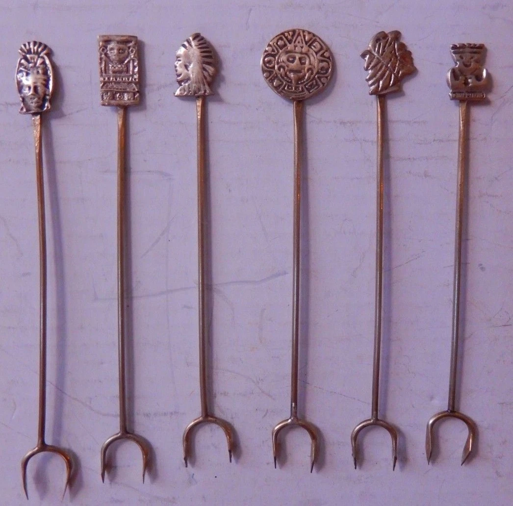 Набор коктейльных серебряных вилок с ацтекскими мотивами. Предназначены для таких закусок как маленькие кубики сыра, кусочки ананаса, оливки, десертов и т.д. ![]()