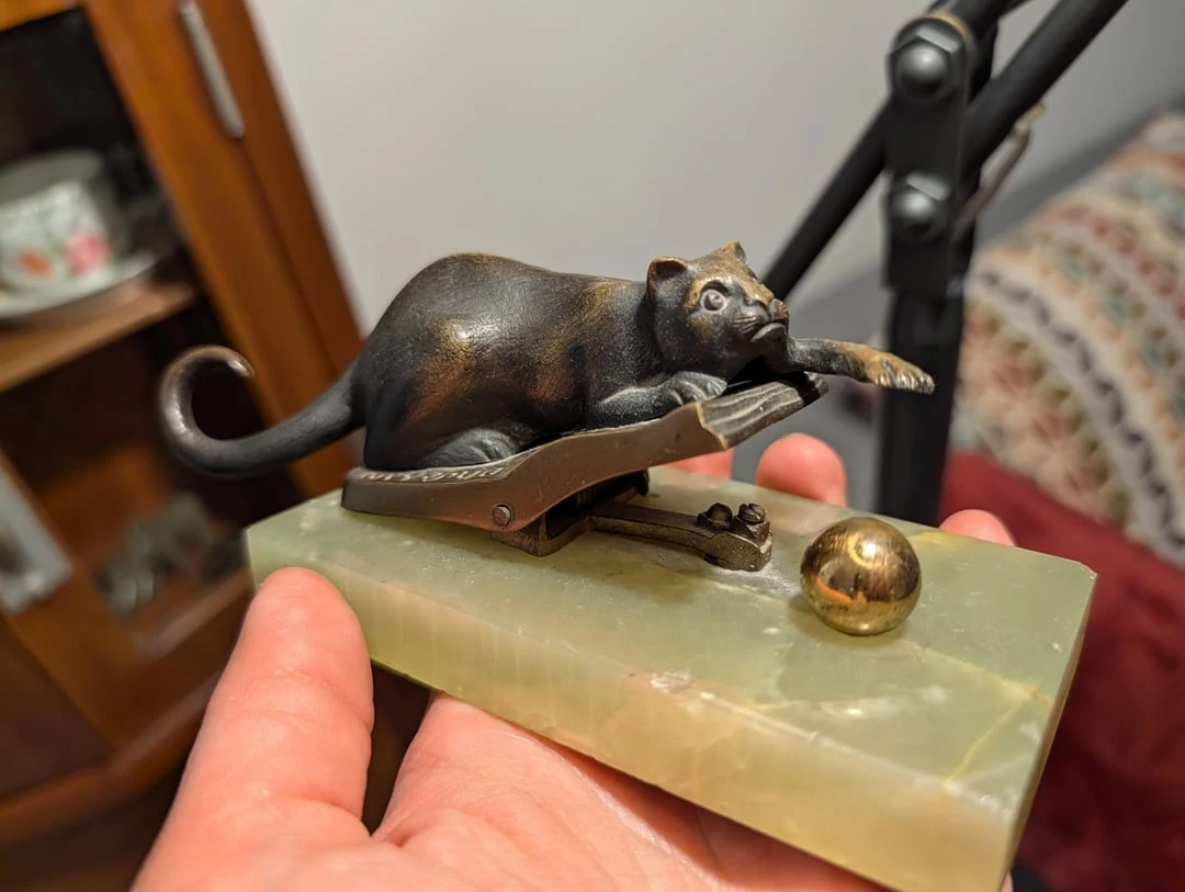 5. Металлическая фигурка кота на обложке книги, охотящегося за мячом