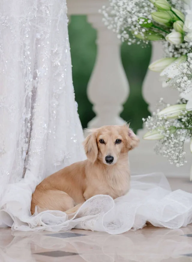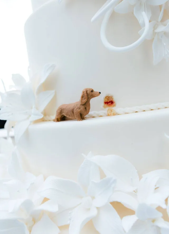 Пёс умудрился появиться почти во всех кадрах свадебной фотосессии и даже попробовал свадебный торт, вызвав улыбки у гостей.