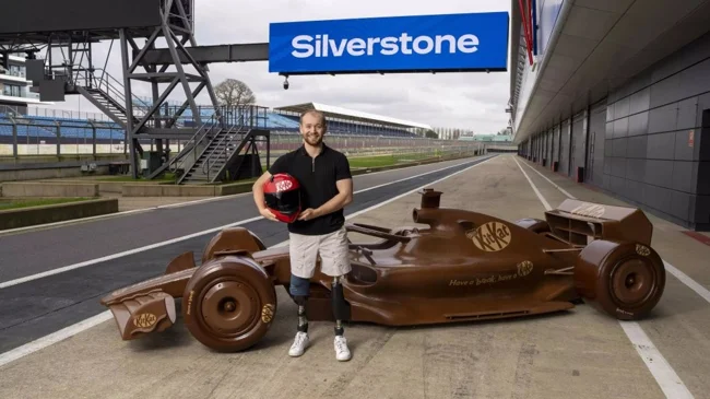 Кондитерский бренд KitKat создал шоколадный автомобиль ручной работы в натуральную величину. Съедобный болид Формулы-1 презентовали на известной трассе «Сильверстоун» в честь начала партнёрства KitKat с главной гоночной серией мира.