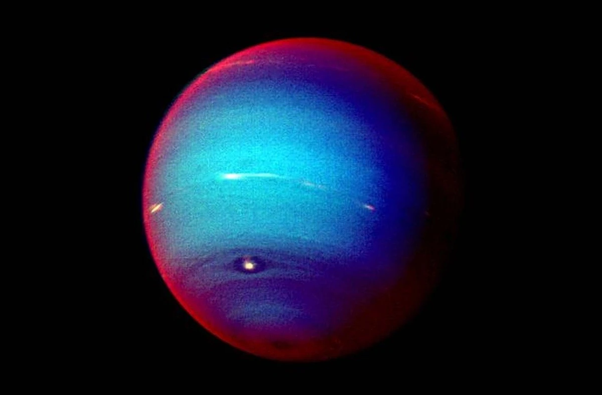 Составное изображение Нептуна в ложных цветах, "сшитое" из снимков "Вояджера-2", полученных через три фильтра. Белые и ярко-красные области показывают солнечный свет, отраженный до прохождения через слои метана; красная кайма по краю диска возникает из-за рассеяния в верхней дымке. В центре свет проходит глубже и сильнее поглощается метаном — поэтому оттенок кажется сине-голубым