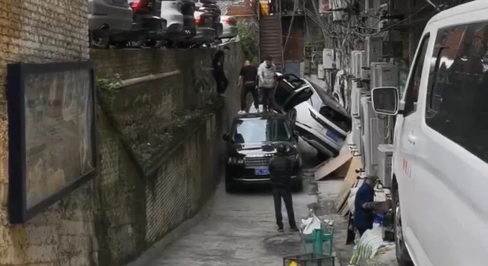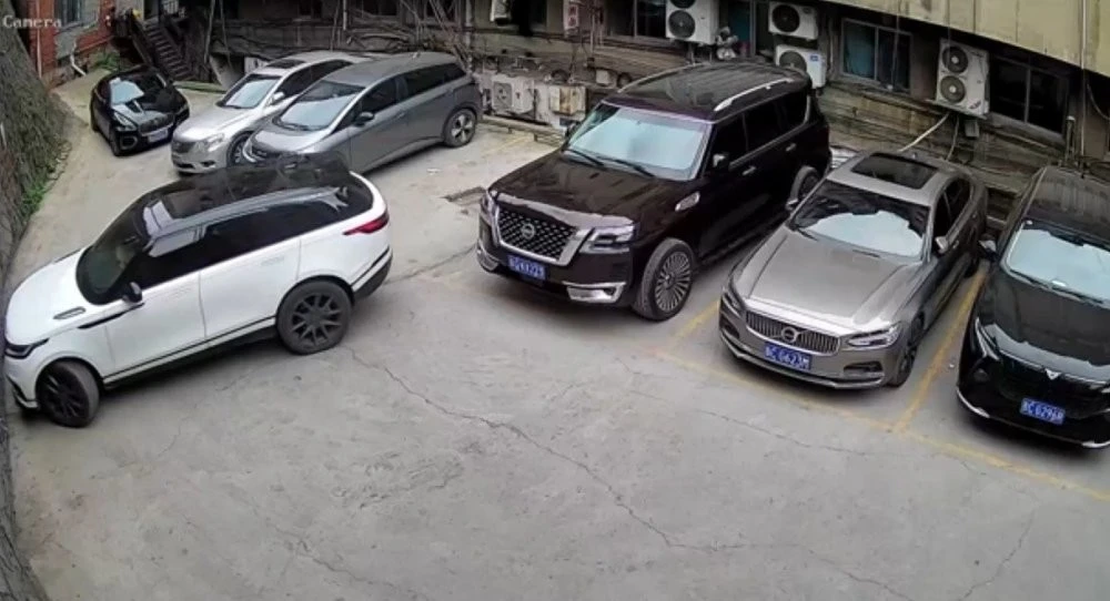 В китайском городе Цзуньи водитель "Ленад Ровера" при припарковаться перепутал педали, задел припаркованный "Ниссан Патрол" и упал на "Рендж Ровер"