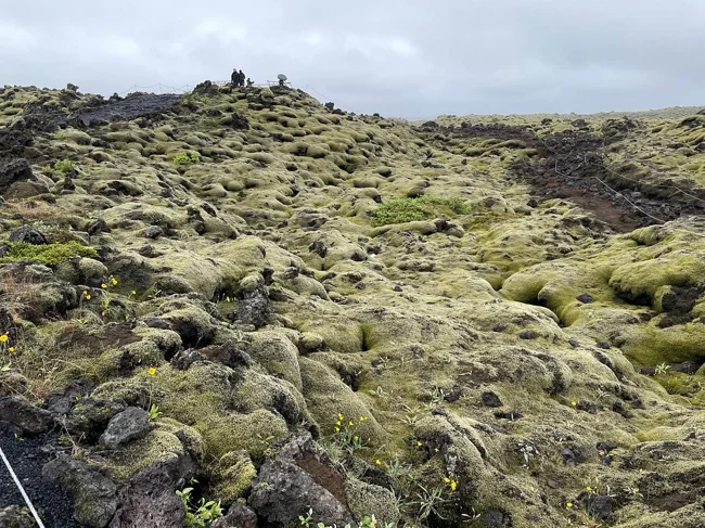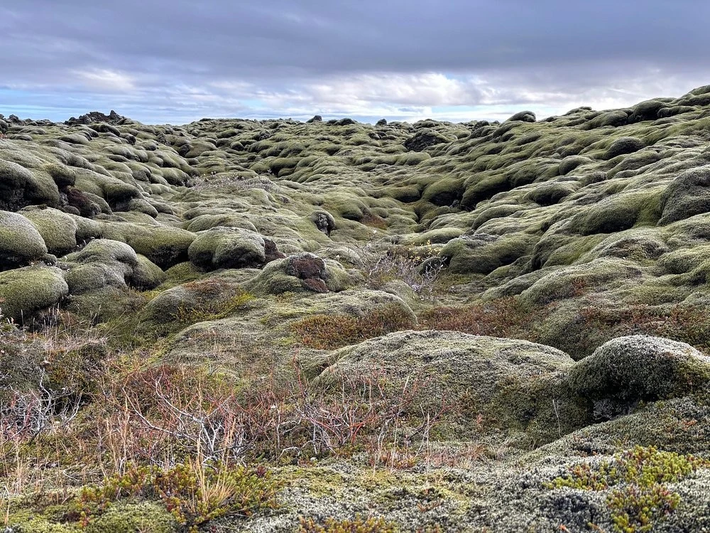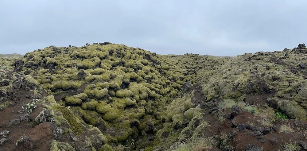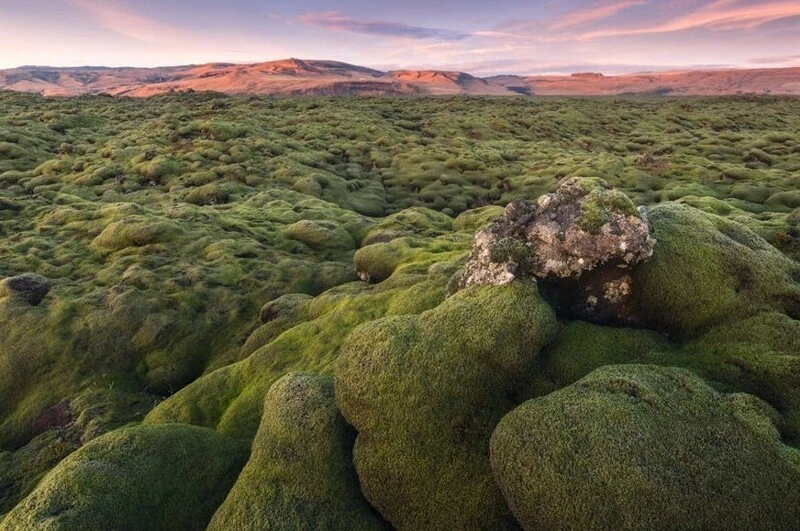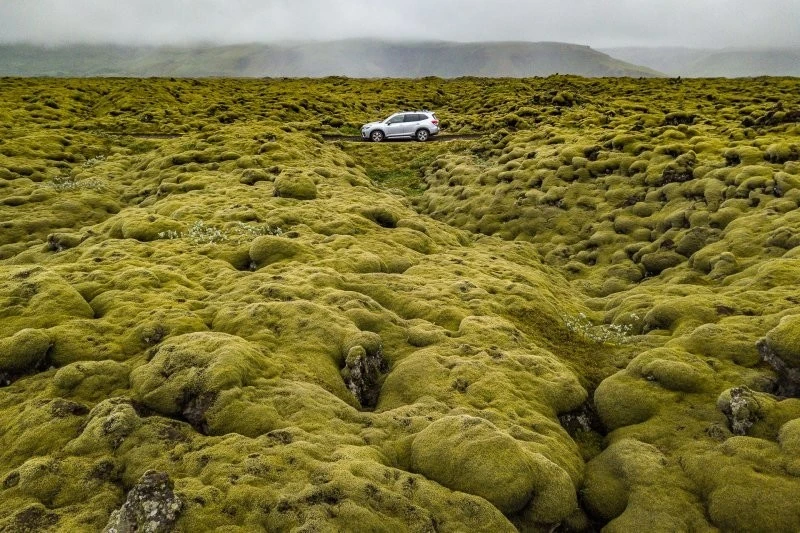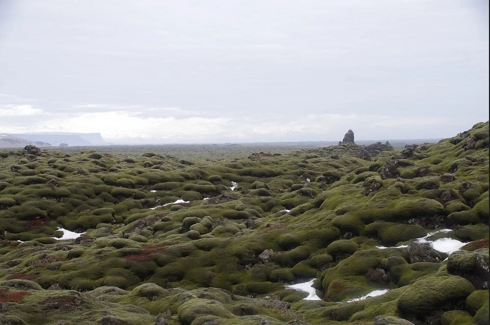Зелёный мох в Исландии вполне привычное явление. Он щедро устилает горные склоны и служит визитной карточкой здешних лавовых полей. Но самое поразительное зрелище ждёт путешественника на южном побережье, там, где раскинулось поле Эльдхрёйн.
