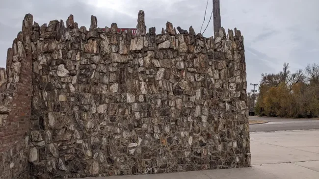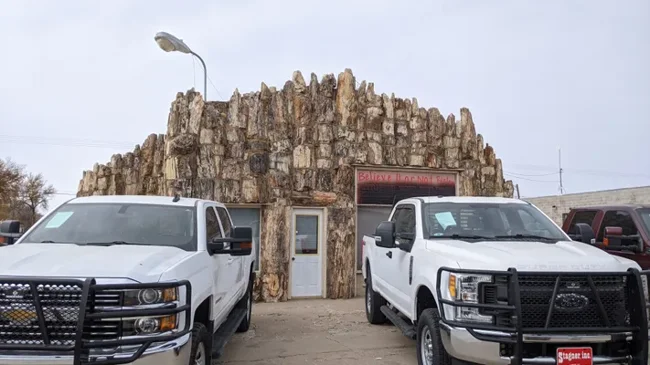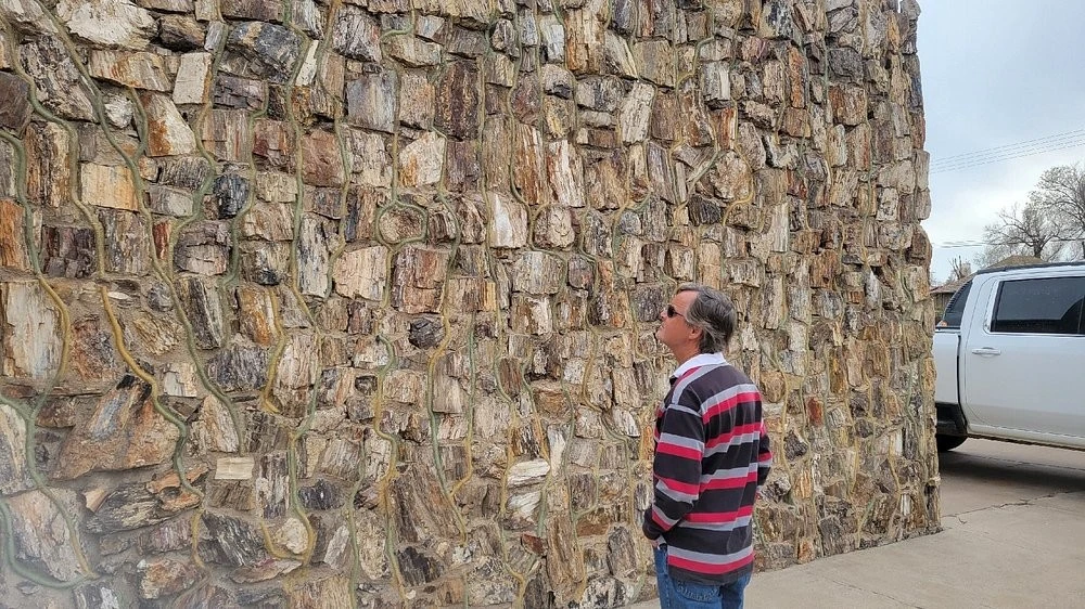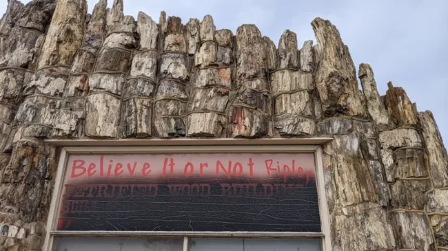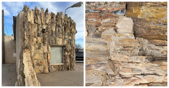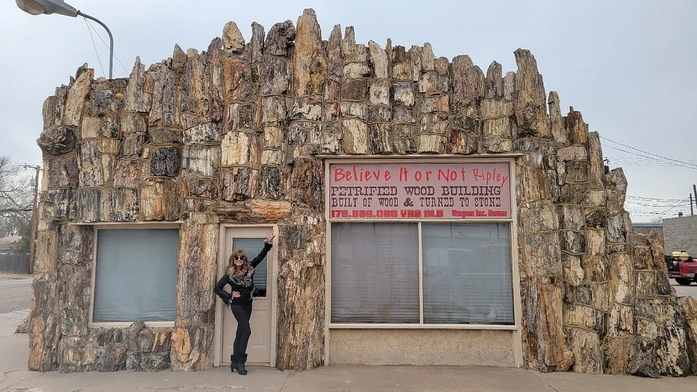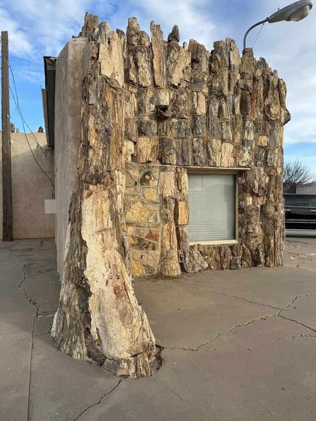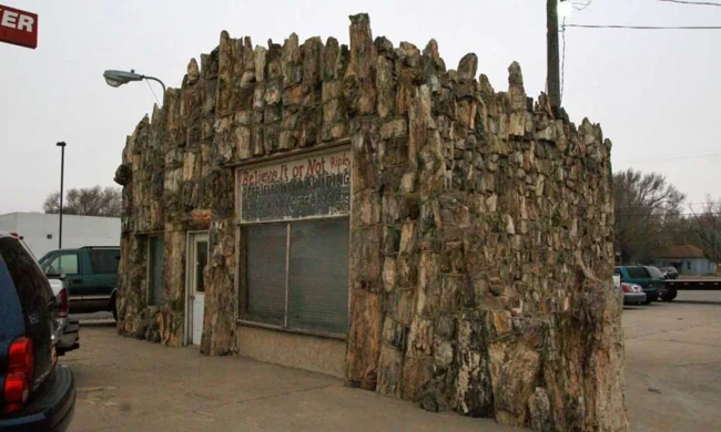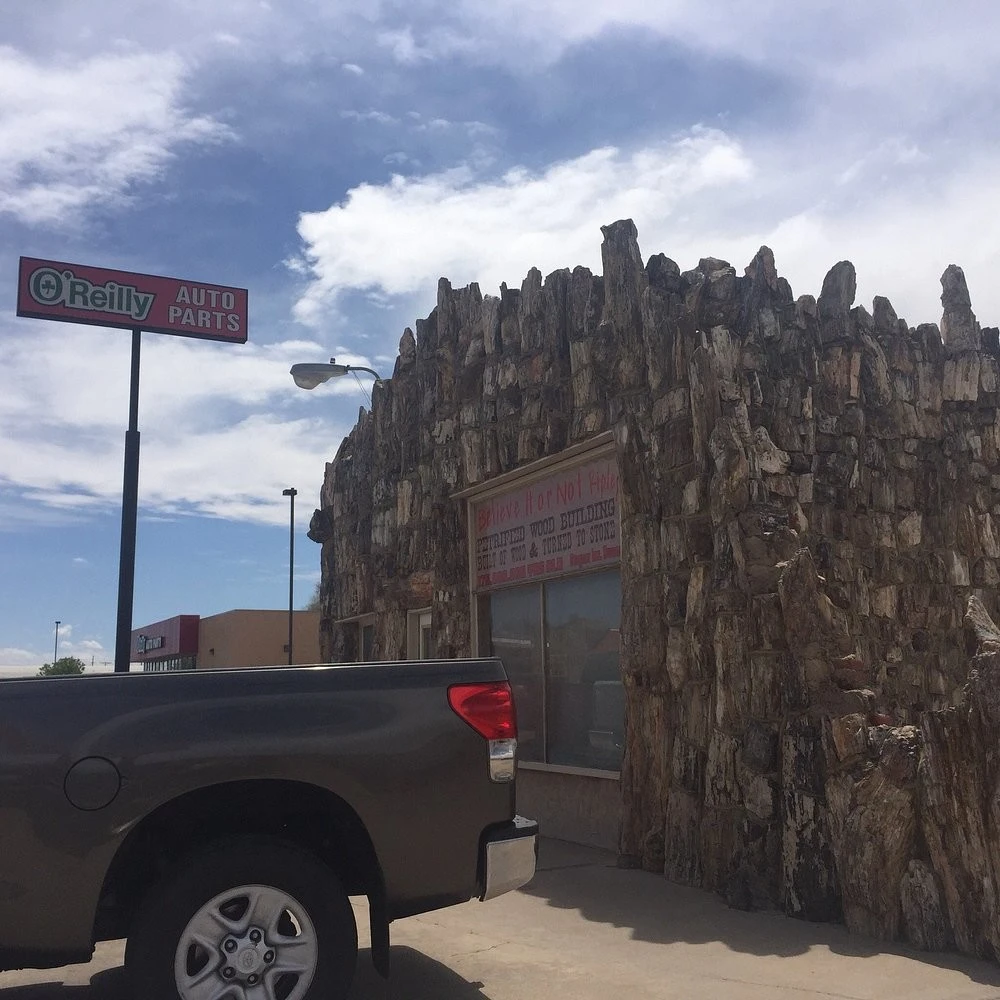 Браун обтесал окаменевшие стволы и сложил из них настоящий дом с витриной и крышей. Даже пол он сделал из этой древесины. А потом повесил вывеску: автозаправочная станция. И добавил мелким шрифтом: самая старая в мире. Потому что возраст стройматериалов действительно перевалил за сотню миллионов лет.