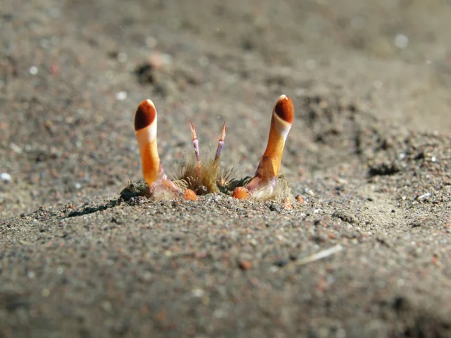 Впрочем, лягушачий краб обычно не ползает по дну тропических морей, а сидит в песке, зарывшись по самые глаза. Благодаря слою песка он становится практически незаметным для проплывающих мимо рыбок, которых членистоногое легко хватает своими краборачьими клешнями. Почему краборачьими? А потому, что они тоже застряли между двумя крайностями.