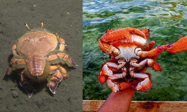 Да-да, всё именно так, все странности внешнего вида лягушачьего краба — кроме, пожалуй, цвета его панциря — объясняются тем, что членистоногое плавно перекатывается в совсем другую группу ракообразных. И, судя по всему, довольно успешно!