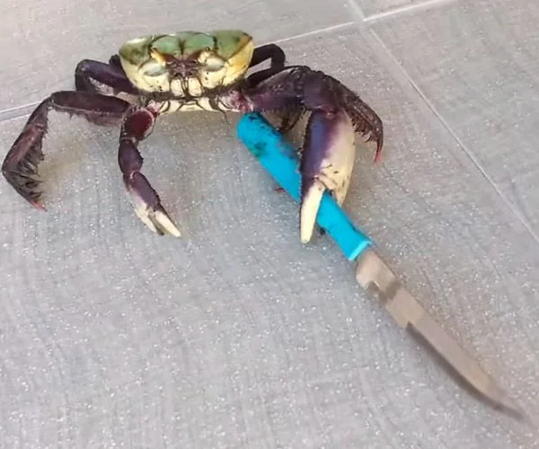 Крабы привыкли полагаться на короткие, но очень широкие клешни. Такими может и не очень удобно кушать или ловить всякую мелочь, зато приятно отрывать куски плоти от падали или добычи, драться друг с другом и держать всякие прикольные штуки. Например, нож.
