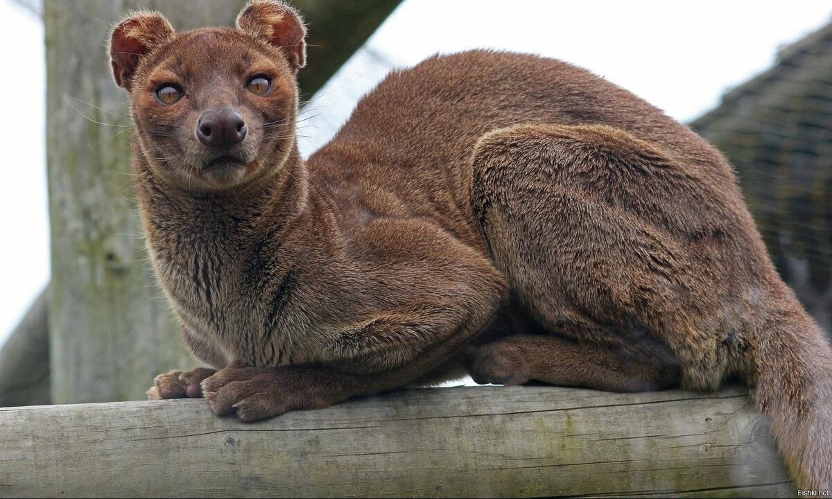 Фосса похожа на маленькую и коренастую пуму. Её вес 7-12 кг. У неё вытянутое и крепкое тело с длинным изящным хвостом и короткие, но очень цепкие лапы, под короткой шерстью которых перекатываются мускулы. И взгляд дикой кошки, готовой сожрать тебя с потрохами. Тем страннее осознавать, что ближайшие родственники фоссы — это мангусты и гиены, которых раньше вообще считали родичами собак!