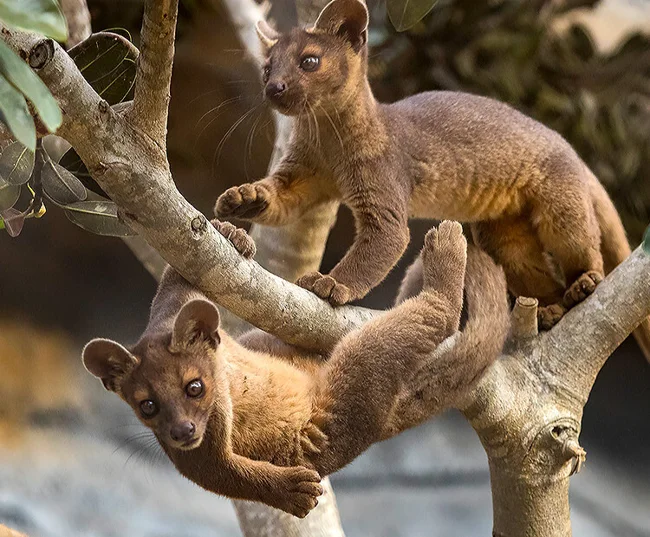 Да, детёныш фоссы висит вниз головой и отлично себя чувствует. Сразу вспоминаются домашние кошки, которые с дерева без помощи слезть не могут.
