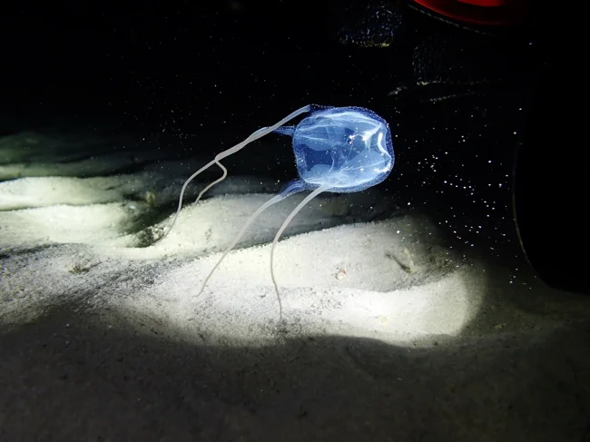 Чуть позже оказалось, что микромедуза не просто токсична и смертельно опасна, но ещё и подла до невозможности. Хоть сама по себе она и маленькая, её щупальца могут вытягиваться на метр от купола. Это очень удобно, когда ты своим ядом парализуешь планктон и мелких рыбок, но очень мешает людям, которые пытаются найти источник своих бед. Попробуй разгляди её на таком расстоянии и под водой!