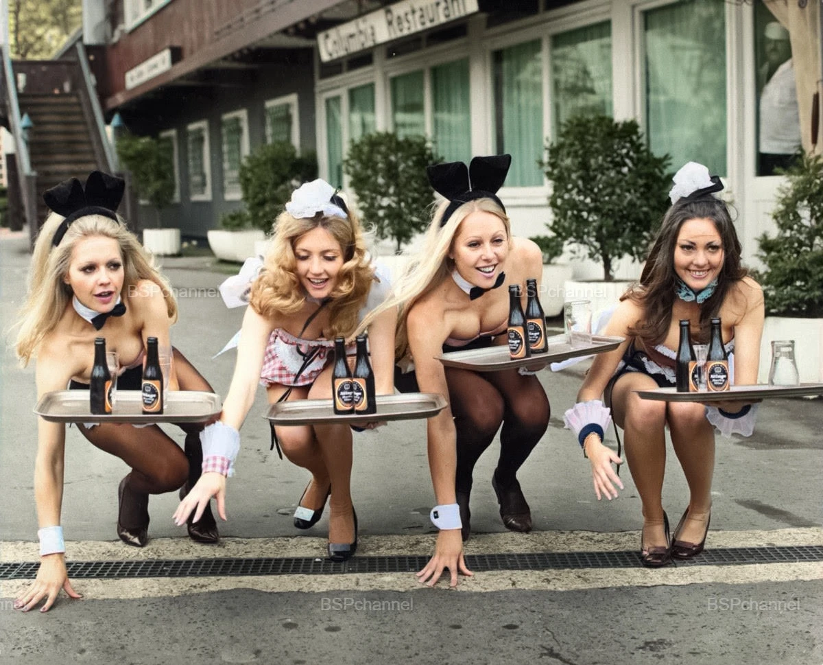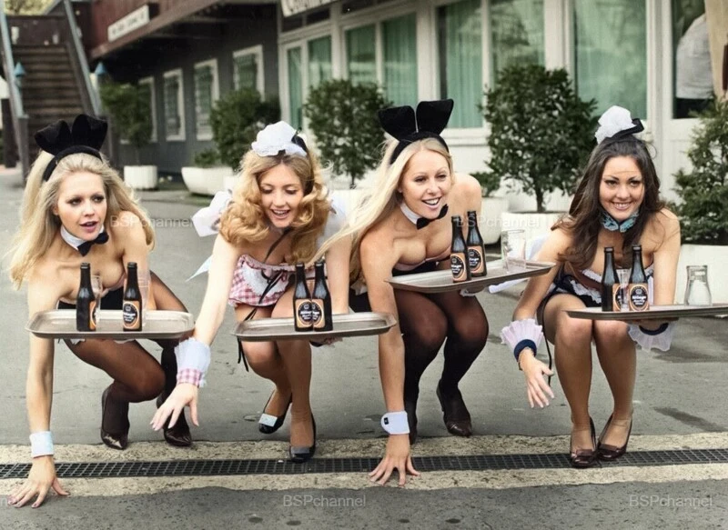 Две девушки-«зайчики» из клуба Playboy и две модели из клуба Penthouse готовятся принять участие в ежегодных соревнованиях официантов и официанток в Страстную пятницу в Баттерси-Садах, Лондон, 28 марта 1972 года.