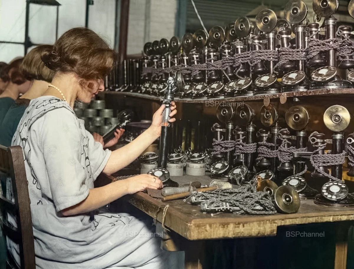 Женщины собирают телефоны на лондонской фабрике, 1924 год.