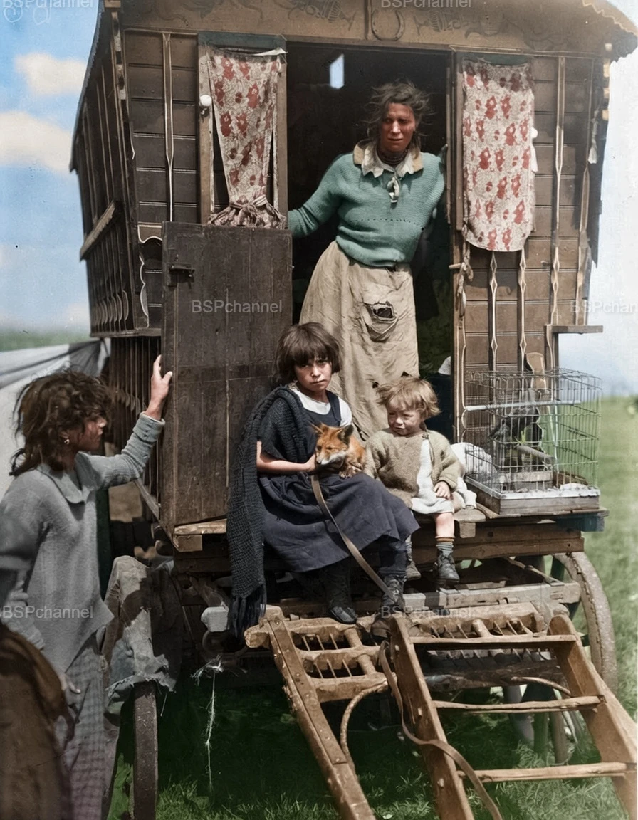 Цыганская семья в задней части своего конного фургона в Эпсоме, графство Суррей. Англия, 1926 год.