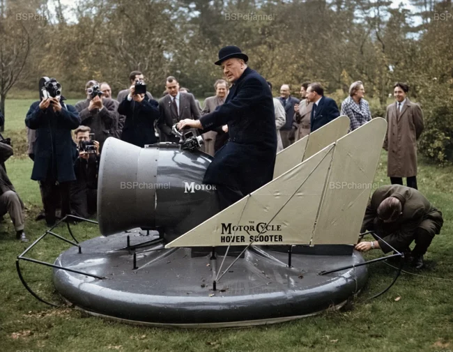 Лорд Брабазон, пионер британской авиации, демонстрирует скутер на воздушной подушке в Лонг-Диттоне, графство Суррей. Машина разработана американским инженером Чарльзом Роудсом и представляет собой гибрид судна на воздушной подушке и скутера. Приводится в движение двухцилиндровым мотоциклетным двигателем объёмом 250 куб. см.