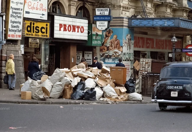 Мешки с мусором в центре Лондона, которые не вывозят из-за забастовки работников коммунальных служб. Лондон, 1970 год.