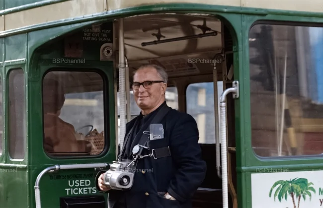 Кондуктор автобуса в Лондоне, 1970 год.