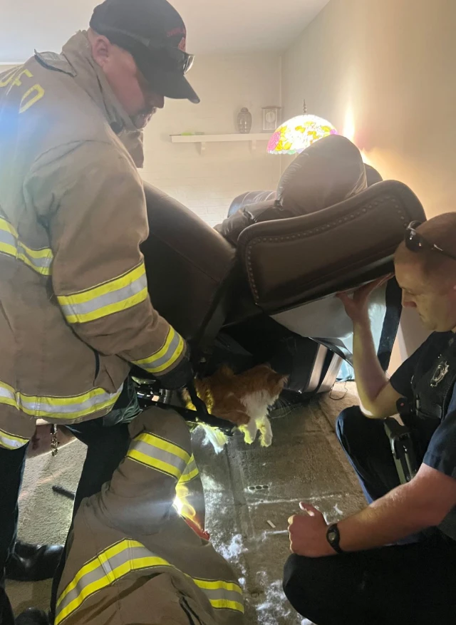 В США толстый домашний кот испугался визита к ветеринару и попытался спрятаться в кресле, но его масса оказалась слишком большой - животное застряло. Хозяину пришлось вызвать пожарных, чтобы освободить застрявшего питомца из мягкой мебели. Спасатели справились без травм, после чего кот всё же доехал до клиники