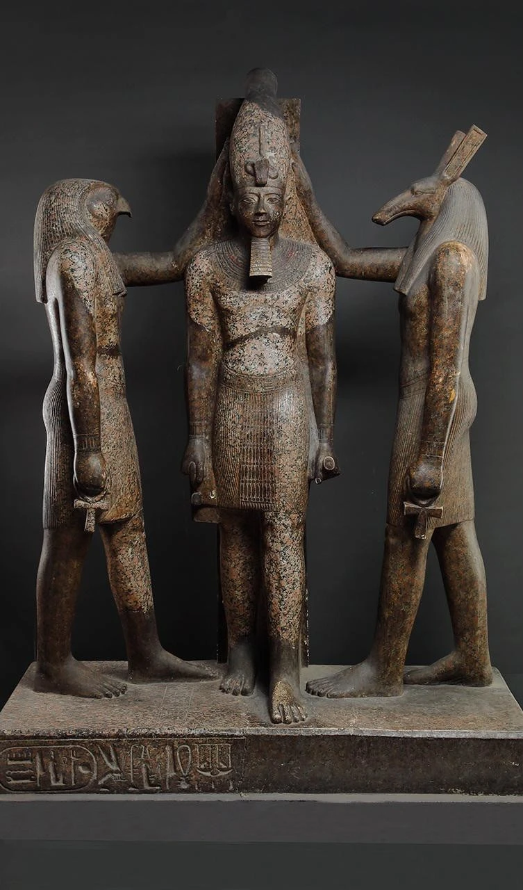 9. Гранитная скульптура царя Рамсеса III в окружении Гора и Сета