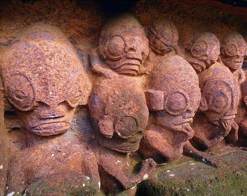 Эти фигуры, вырезанные в каменном блоке примерно в XI веке нашей эры, отличаются большими круглыми глазами и стилизованными человеческими формами.