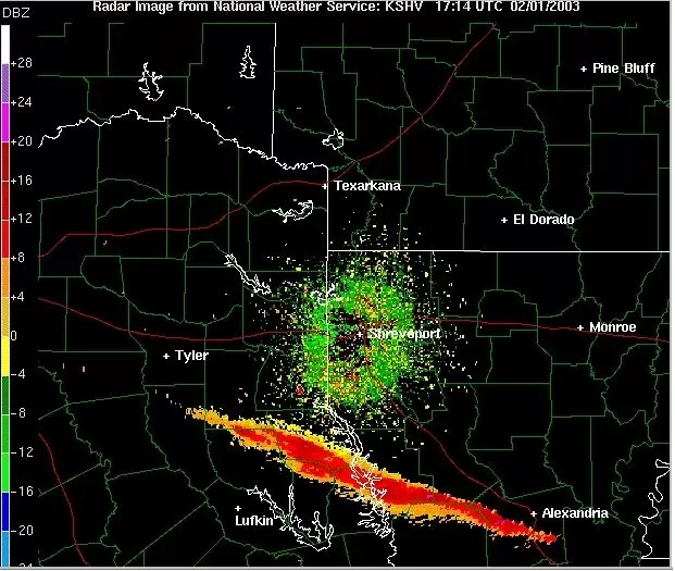 Зона разброса обломков «Колумбии» над Техасом и Луизианой. Фото: Офис Национальной метеорологической службы, Шривпорт, Луизиана., Public domain, via Wikimedia Commons.