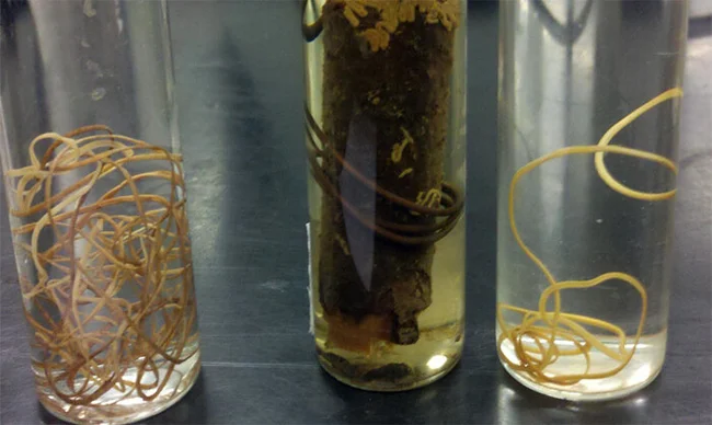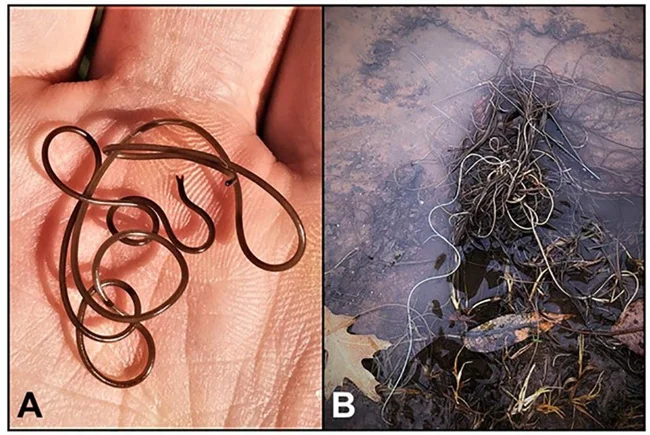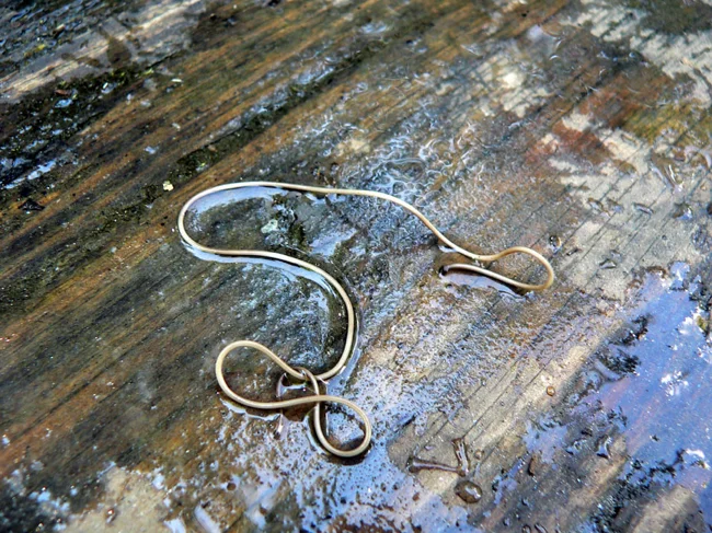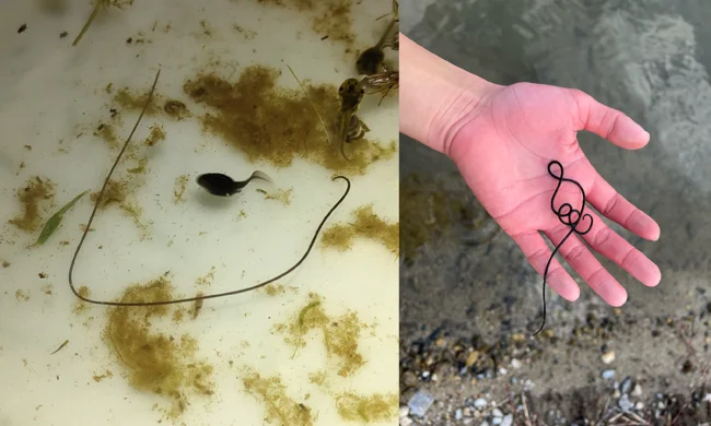 Кстати, волосатики могут селиться даже в головастиках. Но для них это тупиковый хозяин, где они не смогут развиваться. Если же головастика съест хищное насекомое, то червяк сможет завершить свой цикл.