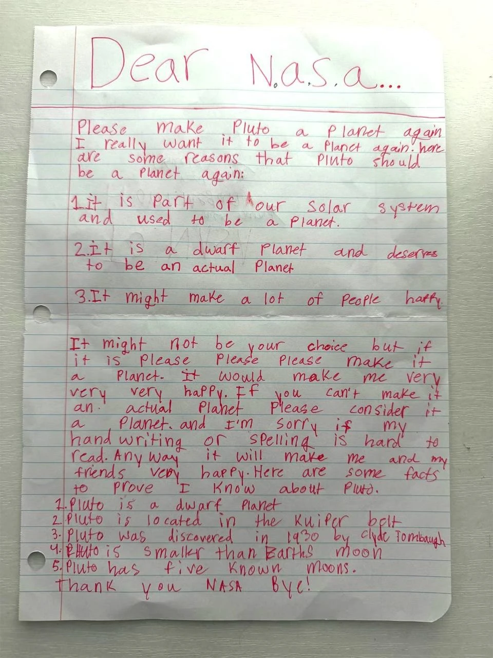 В августе 2006 года решением МАС (Международного астрономического союза) Плутон был безжалостно выпилен из высшей лиги и переведен в разряд «карликов». Каэла, посетив планетарий и оценив масштаб несправедливости, решила, что так дело не пойдет. При поддержке отца, Майка Бойлана, известного местного метеоблогера, письмо было доставлено в NASA через соцсеть X.