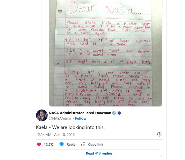 К чести NASA, письмо не отправили в шредер. 9 апреля 2026 года новый администратор агентства Джаред Исаакман лично ответил Каэле: «Мы изучаем этот вопрос». Новость мгновенно стала виральной, а сама виновница торжества в интервью Fox 10 уже озвучила главное условие сделки: если Плутон вернут в строй, это событие должно отмечаться бесплатным мороженым для всех жителей Земли.