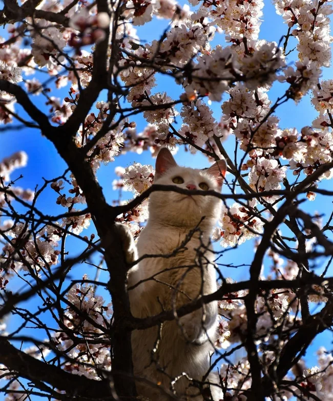 Совсем рядом, если взглянуть на реальность под иным углом, она выглядит иначе. Там солнце не просто светит, а нежно обволакивает, ветки цветущих вишен и яблонь благоухают приятнее самых изысканных духов, а самый главный ценитель момента — рыжий, чёрный, полосатый или белоснежный кот уже занял лучшее место. В этой подборке никакой суеты. Только коты, которые застыли в цветочных горшках, словно редкие растения. Они дремлют на прогретой земле и уютных подоконниках, щурятся от первого тёплого ветра и восседают на ветках цветущей вишни с видом буддийских монахов. Они не торопятся. Они просто дышат, греются и напоминают нам: счастье — это когда есть солнце, цветы и ты.
