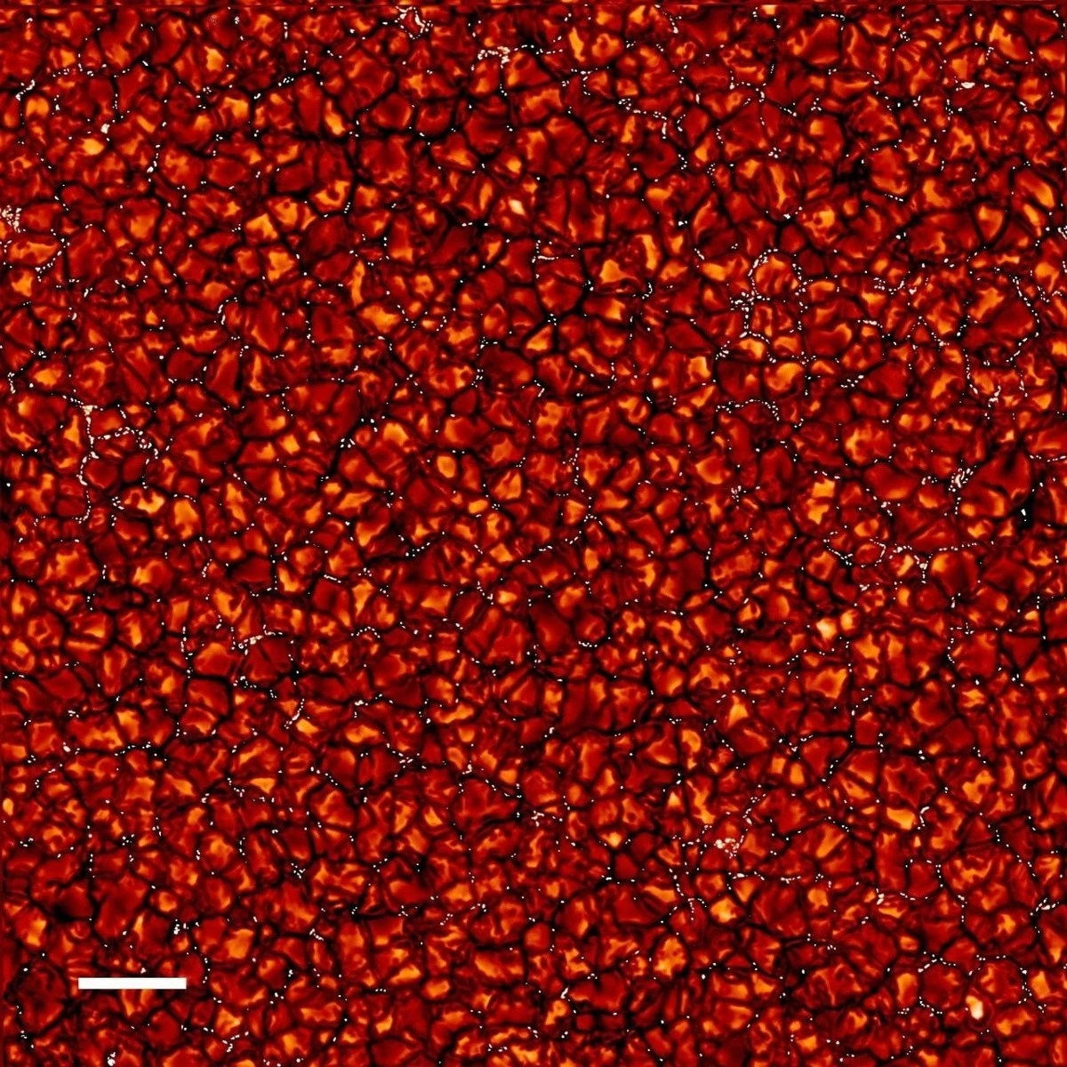 Особого внимания заслуживают крошечные яркие точки в темных межгранульных промежутках. Это не артефакты съемки, а области очень сильных локальных магнитных полей. Они выглядят ярче потому, что магнитное давление меняет структуру плазмы, позволяя нам увидеть более глубокие и горячие слои звезды, лежащие ниже фотосферы. Именно поэтому на снимке эти участки выделяются как маленькие сверкающие "искорки" среди более темной сетки.