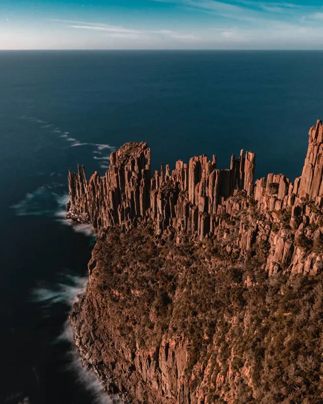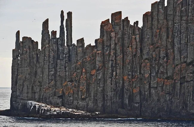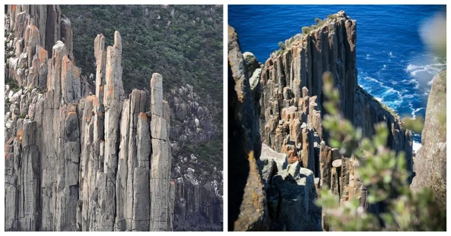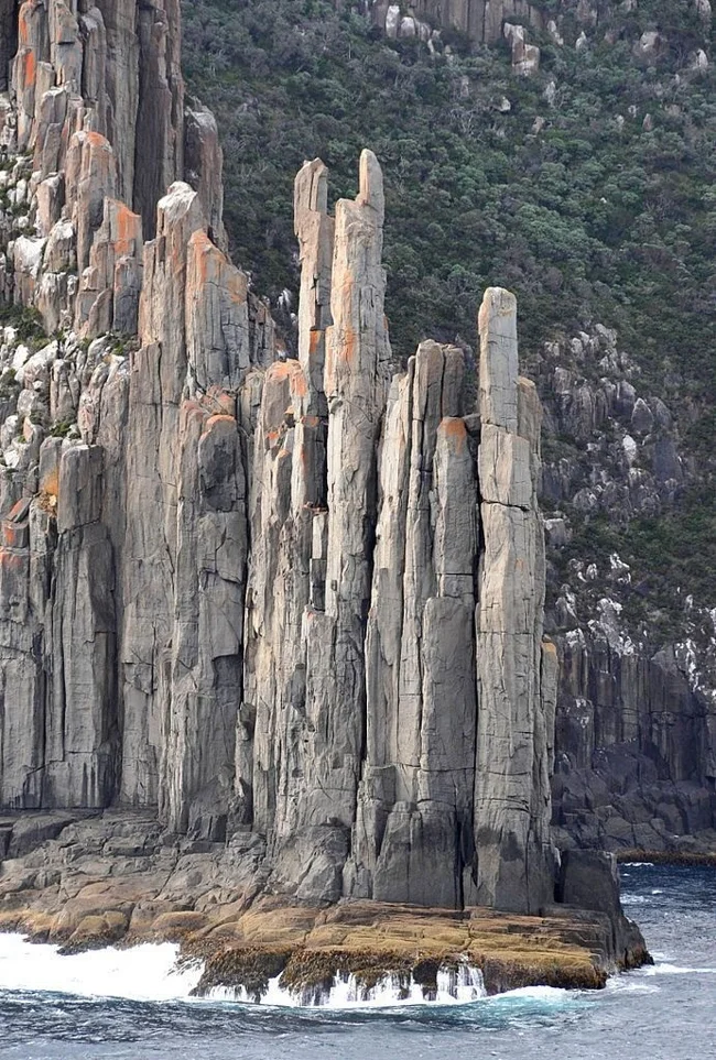 Там, в Австралии, береговая линия превратилась в частокол из каменных колонн высотой до 300 метров. Это долериты. У них узнаваемая вытянутая форма и идеальные шестигранные сечения.
