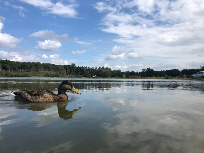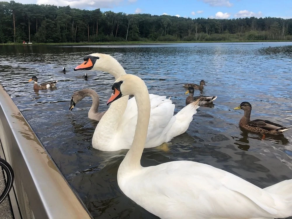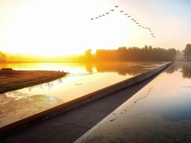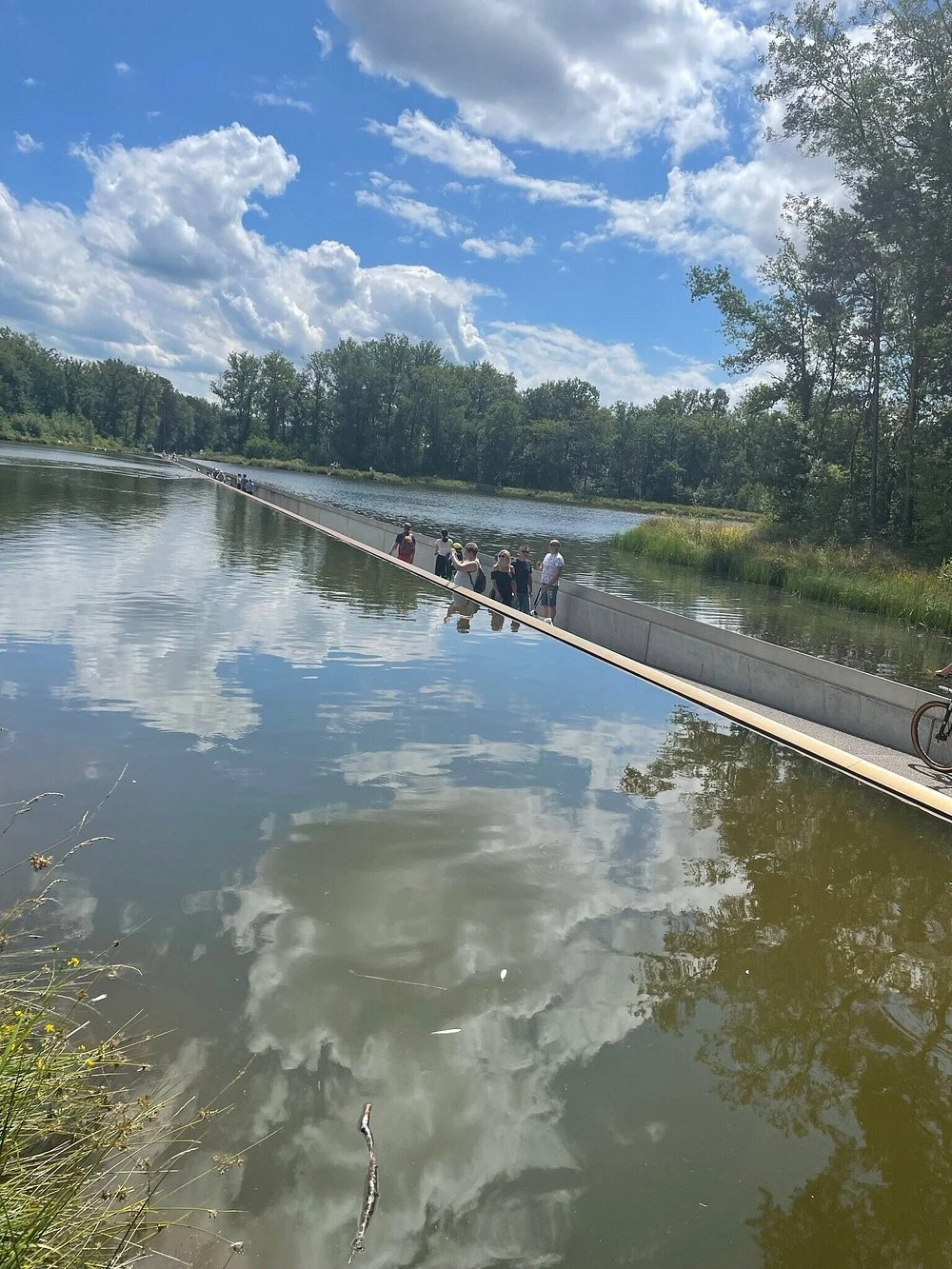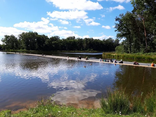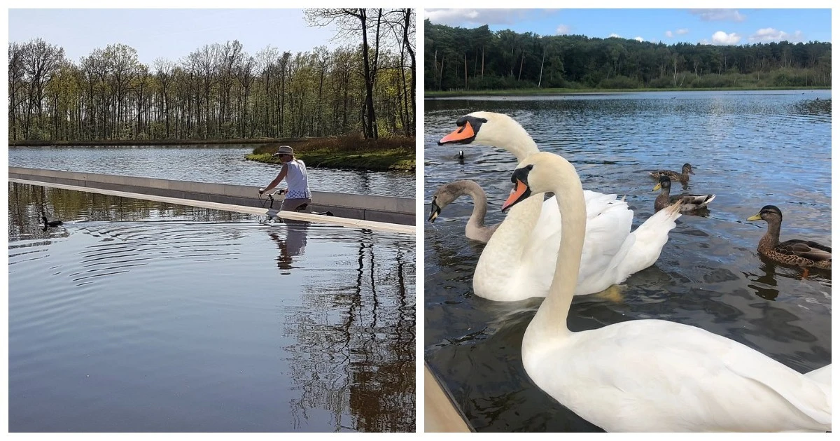 200-метровая трасса не идёт над озером. Она буквально врезается прямо в него. Дорожка опущена почти на полтора метра ниже уровня воды, и глаза велосипедиста оказываются на одной линии с поверхностью пруда. По бокам только водная гладь. Летом можно встретиться взглядом с проплывающей уткой, а зимой в упор разглядеть отражение неба в замёрзшей глади.