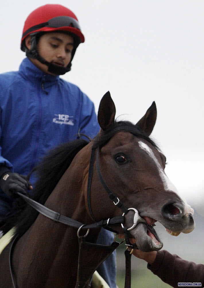 3. Новичок Preakness Stakes, лошадь Yawanna Twist, заканчивает утреннюю тренировку вместе с жокеем Мауриллио Гарсия, 13 мая 2010 года. (AP Photo/Rob Carr)(AP)