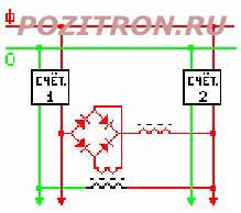 Значительного увеличение отрицательной погрешности индукционных эл.счётчиков можно добиться пропуская через их токовые катушки постоянный ток, который будет делать из сердечника токовой катушки магнит. Магнит в свою очередь вызывает торможение диска эл.счётчика. Подобный (постоянный) магнит есть в каждом индукционном эл.счётчике. Дополнительный магнит – дополнительное торможение . На рис. 1 синим цветом отмечено диск, красным – токовую цепь, зелёным – рабочее магнитное поле к которому будет подмешиваться постоянная составляющая. Чтобы просто осуществить подачу постоянного тока по токовым катушкам требуется два счётчика подключённых к одной фазе. Можно, например, «скооперироваться» с соседом, или под любым предлогом оформить дополнительный счётчик. Осуществляется это согласно схеме 2.