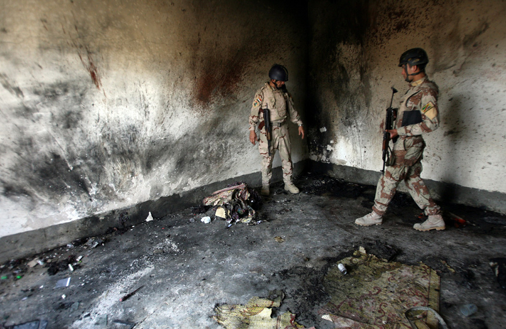 33. Иракские солдаты осматривают комнату, где один из подозреваемых предположительно изготовлял взрывные устройства. 2 июня террорист взорвал себя, когда войска окружили его дом, расположенный в районе Сабаа аль-Бор, к северу от Багдада. (ALI AL-SAADI/AFP/Getty Images)