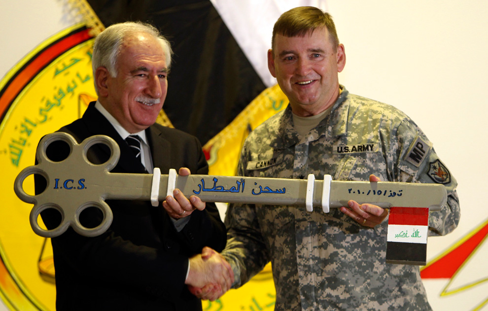 32. Генерал-майор Джерри Кэннон передает большой ключ министру юстиций Ирака Даре Нур-Элдене во время церемонии, знаменующей вывод войск из лагеря Кроппер – последнего центра задержания подозреваемых в Ираке. (REUTERS/Saad Shalash)
