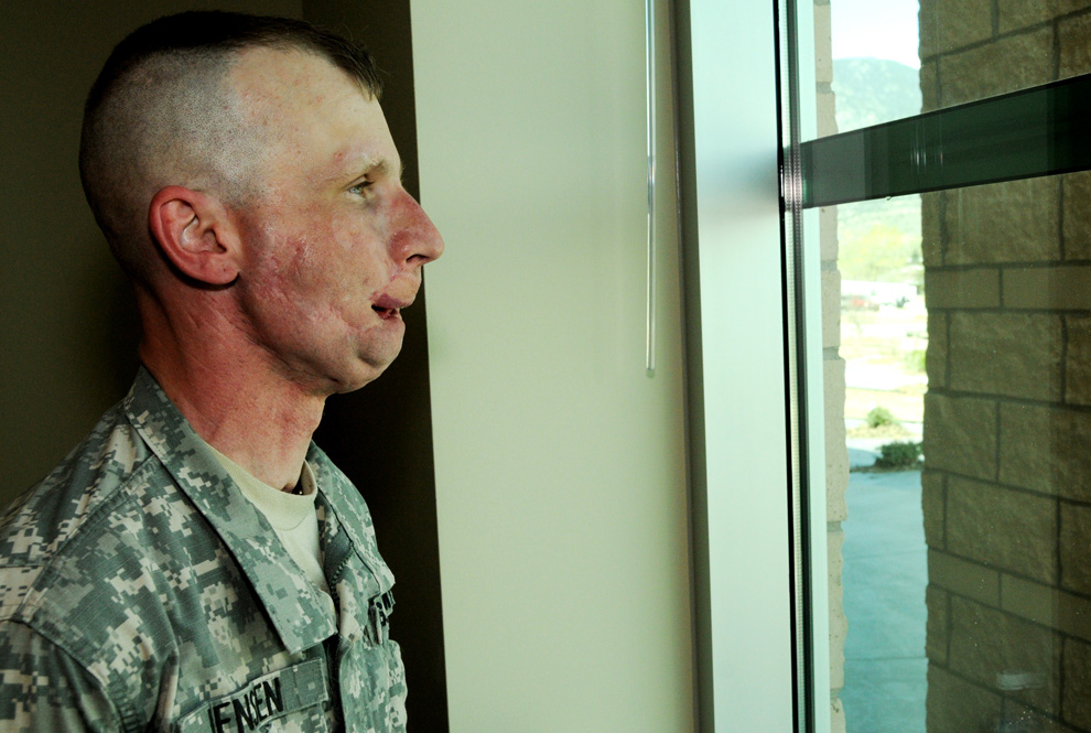 42. Сержант Джерральд Дженсен, получивший серьезное ранение в Ираке, недавно вернулся на службу в Форт Карсон, штат Колорадо после лечения. В результате взрыва СВУ Дженсену повредило большую часть лица, после чего медикам пришлось восстанавливать челюсть. (U.S. Army/Alexandra Hemmerly-Brown)
