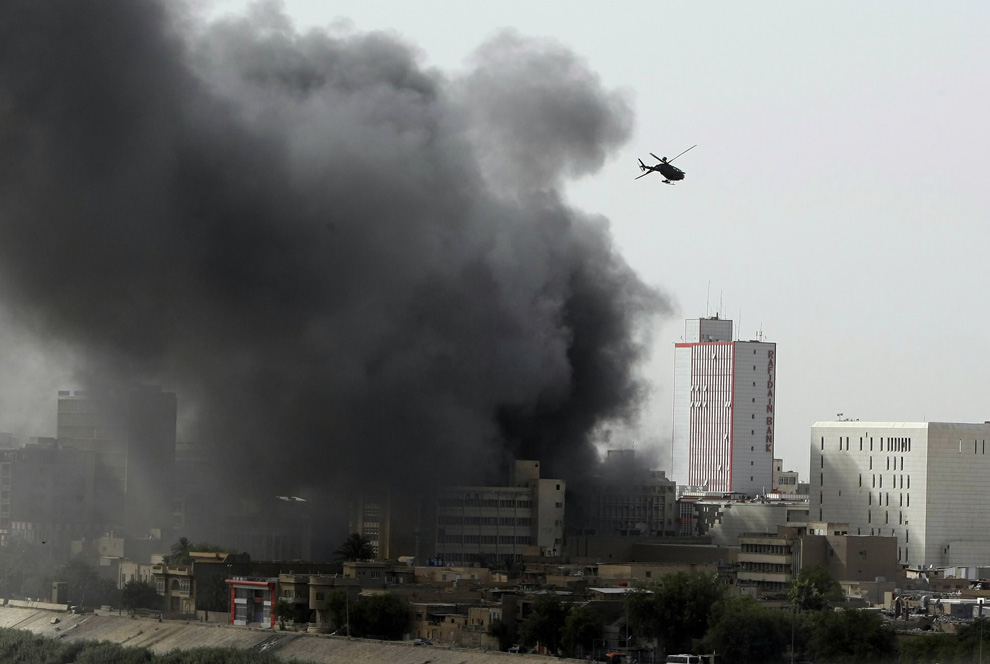 28. Вертолет американской армии летит над районом Багдада, где были 13 июня прогремело несколько взрывов. С интервалом в несколько минут в центре иракской столице произошла целая серия терактов, в результате чего погибли два человек. (Sabah Arar/AFP/Getty Images)
