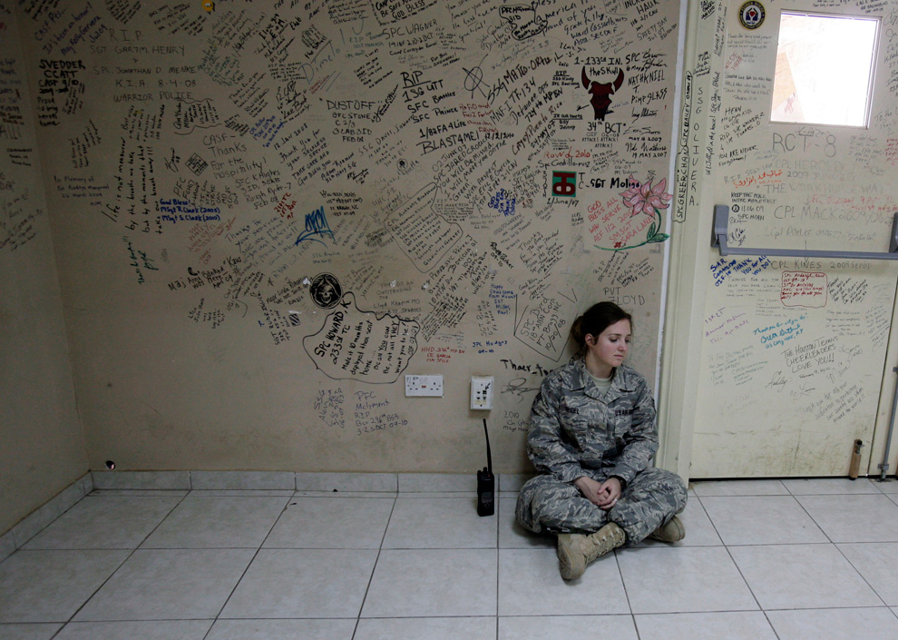 27. Медик ВВС Рейчел Рейдел присела отдохнуть в «Зале героев» 8 мая. В этой комнате раненые солдаты отдают дань памяти своим погибшим товарищам в ожидании эвакуации в Германию из больницы на базе Джойнт Балад. (AP Photo/ Maya Alleruzzo)
