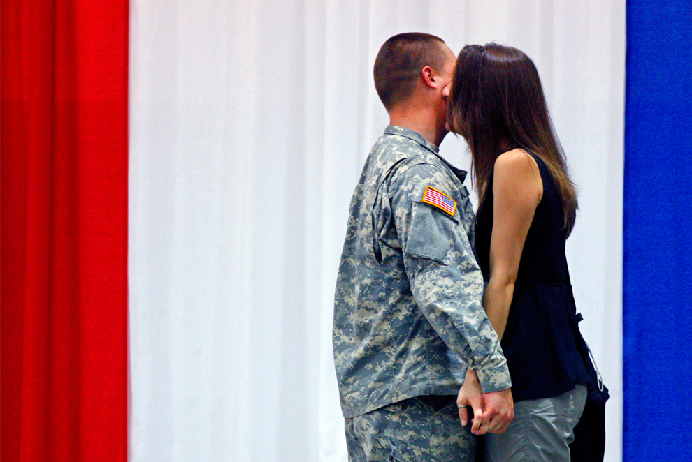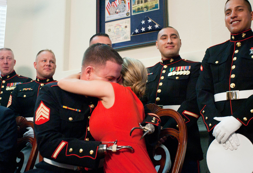 26. 34-летний сержант Джеймс Райт обнимает свою невесту Коди Файф, после того как она приняла его предложение о женитьбе. Сержанту Райту вручили Бронзовую звезду за его действия во время перестрелки с боевиками в Фаллудже в 2004 году. В результате взрыва гранаты ему оторвало обе руки, раздробило бедро и левую ногу. С момента учреждения четыре года назад программа «В помощь героям» подарила уже 19 домов военнослужащим-инвалидам проходившим службу в Ираке или Афганистане. В подобных домах есть все необходимое для людей, получивших серьезные ранения. (AP Photo/The Courier, Eric S. Swist)