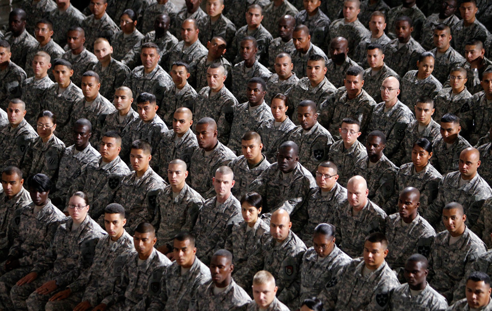 24. Военнослужащие армии США на церемонии принятия гражданства во дворце Аль-Фав, 4 июля. В тот день американское гражданство получили 156 военнослужащих из 56 стран. (REUTERS/Thaier al-Sudani)