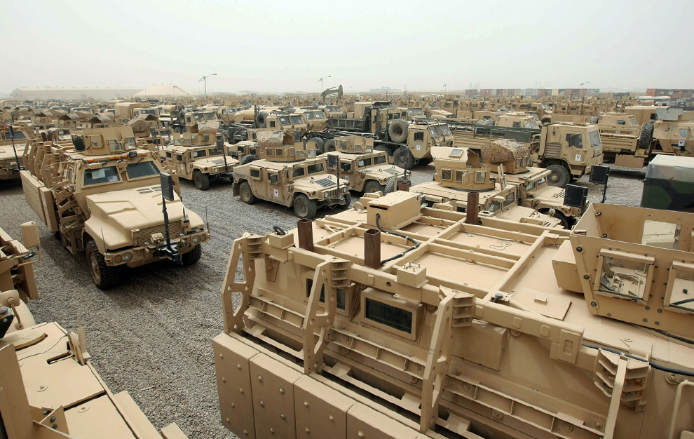 41. Сотни американских бронетранспортеров стоят на парковке на крупной военной базе на краю аэропорта Багдада 24 июня. Американские солдаты осматривают автомобили в поисках вещей, который можно забрать домой, отправить в Афганистан или уничтожить – через два месяца начнется операция по выводу американских войск с территории Ирака. (AHMAD AL-RUBAYE/AFP/Getty Images)