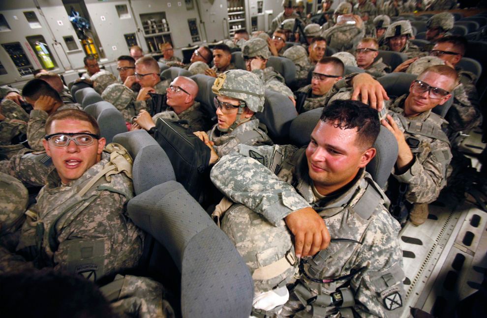 21. Солдаты армии США на борту самолета C-17 в Международном аэропорту Багдада 13 июля готовятся к путешествию домой. Отслужив девять месяцев эти военные покидают Ирак в рамках операции вывода американских войск из страны. (AP Photo/Maya Alleruzzo)
