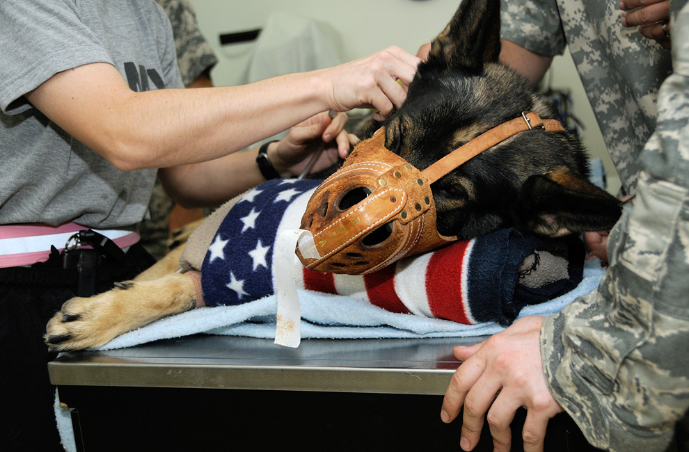 19. Собаке M745 делают наркоз, чтобы взять анализ крови, 3 июля на базе Джойнт Балад. У военных собак берут кровь, чтобы выяснить, подходят ли они на роль доноров. (U.S. Air Force/Tech. Sgt. Caycee Cook)