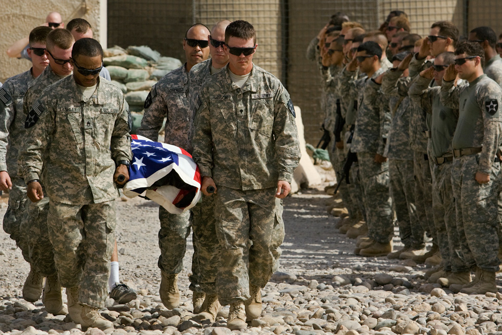 13. Солдаты несу тело своего товарища, погибшего в результате взрыва бомбы, 11 июля, недалеко от Джалулы, провинция Дияла. 23-летний солдат Уильям С.Яух и его 24-летний товарищ Израиль П.Обрайян, а также два гражданских и один иракский полицейский погибли, когда в колонну их патруля въехал автомобиль с террористом-смертником за рулем. (Warrick Page/Getty Images)