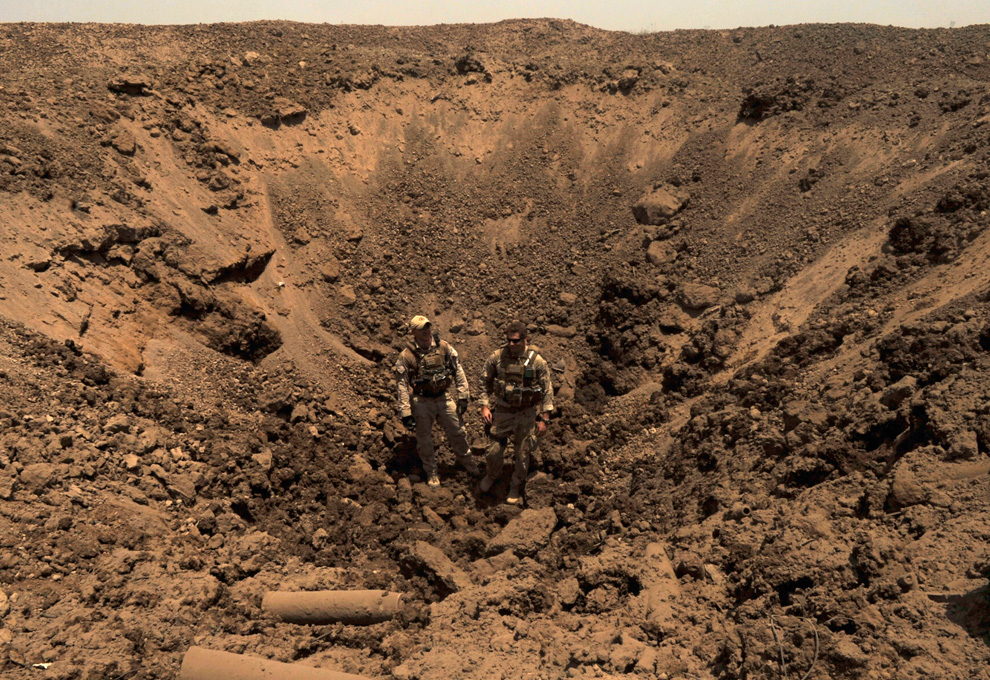40. Американские моряки осматривают воронку, оставленную после взрыва снаряда на саперном полигоне в провинции Дияла 17 июля. В результате совместных операций по уничтожению снарядов американские саперы обезвредили 45 килограмм взрывчатых веществ, изъятых иракскими полицейскими. (U.S. Navy/Mass Communication Specialist 2nd Class Ted Green/Released)