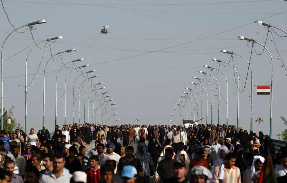 9. Шиитские мусульмане-паломники идут по мосту из суннитского района Адхамия к району Кадхимия, названному в честь имама Муса Кадхима, седьмого из 12 почитаемых имамов в шиитском исламе. Паломники пришли почтить имама на следующий день после того, как террорист-смертник взорвал себя, унеся жизни 28 паломников. (AHMAD AL-RUBAYE/AFP/Getty Images)