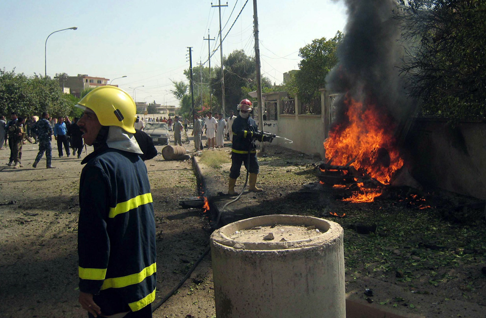 6. Иракские пожарные быстро прибыли на место взрыва автомобиля террориста-смертника у правительственного здания в Киркуке, на севере страны. В результате теракта ранения получили 9 человек, включая представителя власти, ведающего религиозным имуществом. (MARWAN IBRAHIM/AFP/Getty Images)