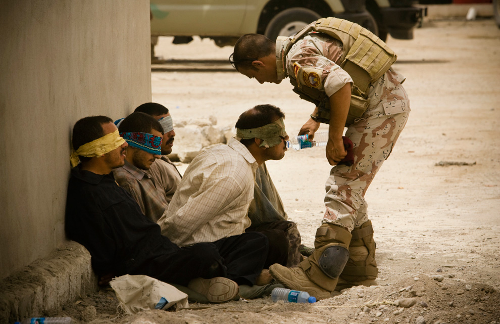 5. Иракский солдат из второго дивизиона поит арестантов водой по возвращении на базу после утренней операции 5 июня. (Warrick Page/Getty Images)
